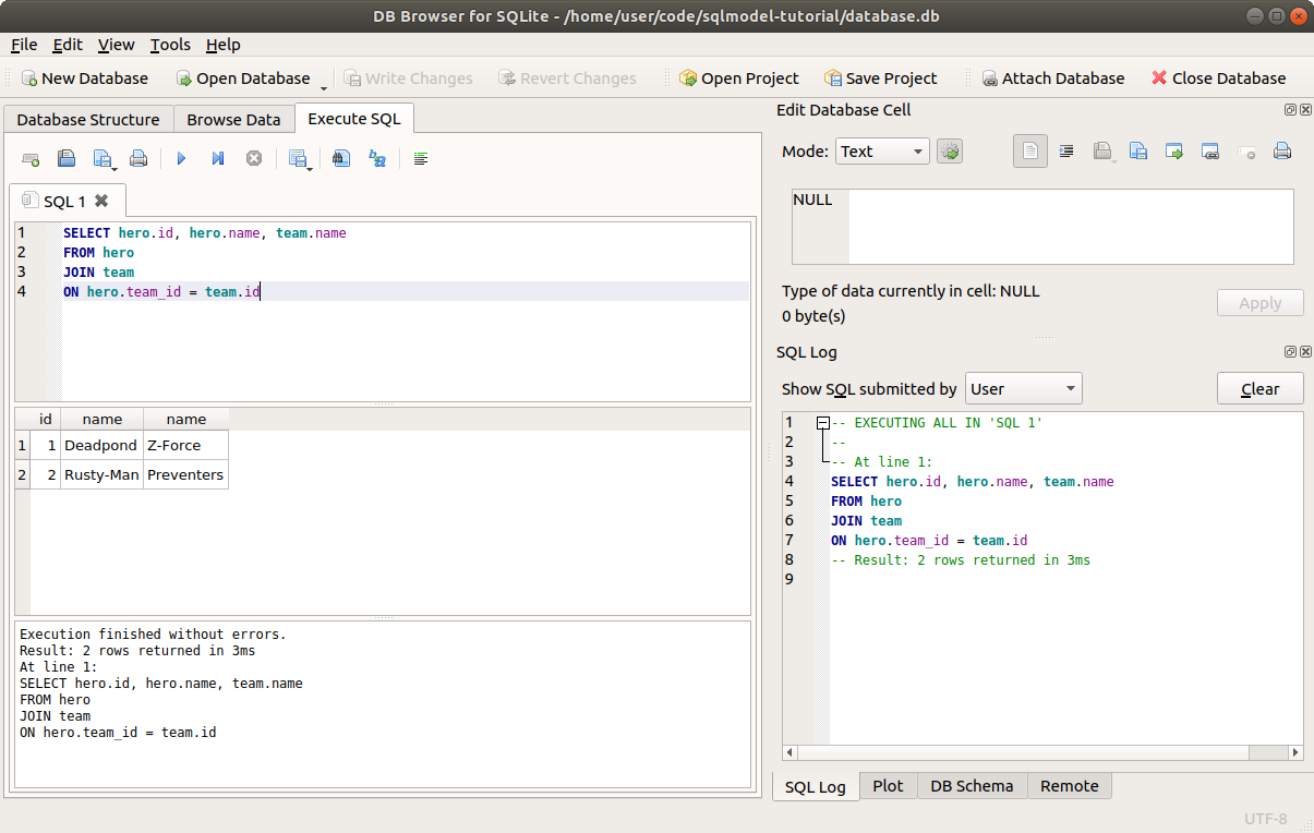 By putting the Team in select() we tell SQLModel and the database that we want the team data too.